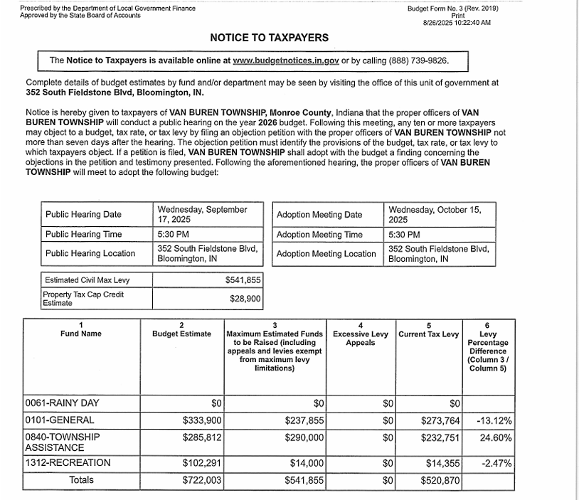 Notice is hereby given to the taxpayers of Van Buren Township, Monroe County, Indiana that the Board of the Van Buren Trustee will meet on Wednesday, September 17, 2025 at 352 S Fieldstone Blvd in the Township Conference Room in the Township Building at 5:30 pm to consider the adoption of the Township’s Capital Improvement Plan.